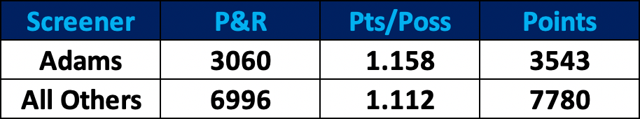But Adams also plays an underrated offensive role, given that he is arguably the league’s best screen-setter. He led the NBA in screen assists per game (5.6) last year, and was tied for second year the year before (5.5). Memphis unsurprisingly has been a better pick and roll team with Adams setting the screen than it has been with anyone else doing so.