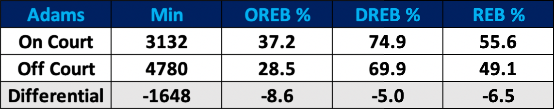 Much of this can be attributed to his dramatic impact on the team’s efforts on the glass. With Adams, Memphis is the best offensive rebounding team in the NBA. Without him, it is an ordinary one. With Adams, the Grizzlies are a pretty good defensive rebounding team. Without him, they are a bad one.