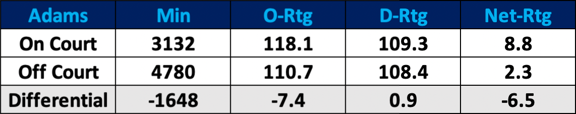 During his two years with the Grizzlies, Memphis has been considerably better with Adams on the floor than when he’s been on the bench.