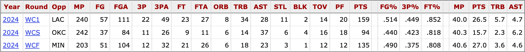 I’ll make it easy for you: He was far less aggressive offensively in the series against Oklahoma City than he was against either the Clippers or Minnesota. I don’t think it’s a coincidence. Against OKC, he was tasked largely with guarding Jalen Williams. Physically, that’s a really significant challenge for him. Much more so than guarding either James Harden or Mike Conley were in the other two rounds.