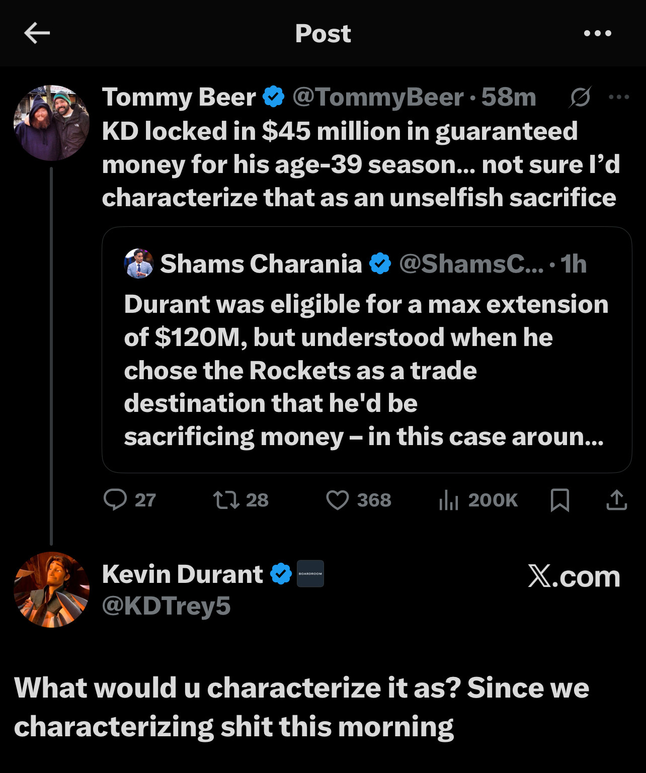 They've shown that they're willing to play hard ball with pretty much anybody in order to get one of those discounts, but it doesn't seem like that was required here. Durant took a deal that compensates him handsomely — and probably at an appropriate level, given his age and injury history — for what could very well be the last few years of his career, so that he can play for a title contender during that span.