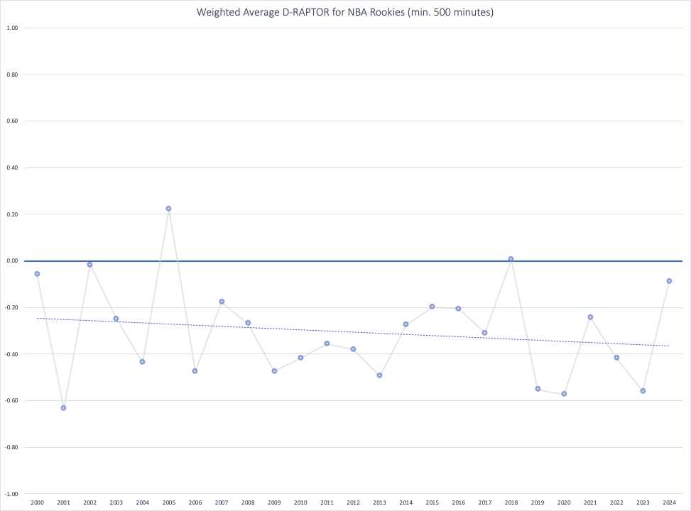 So, I headed over to ’s Substack and called up his Estimated Defensive RAPTOR numbers, then calculated the minutes-weighted average Defensive RAPTOR for every rookie class since 2000. Contrary to Matt’s belief, rookies have not been getting better on defense lately. In fact, the trend in recent years is on a (very) slightly downward slope.