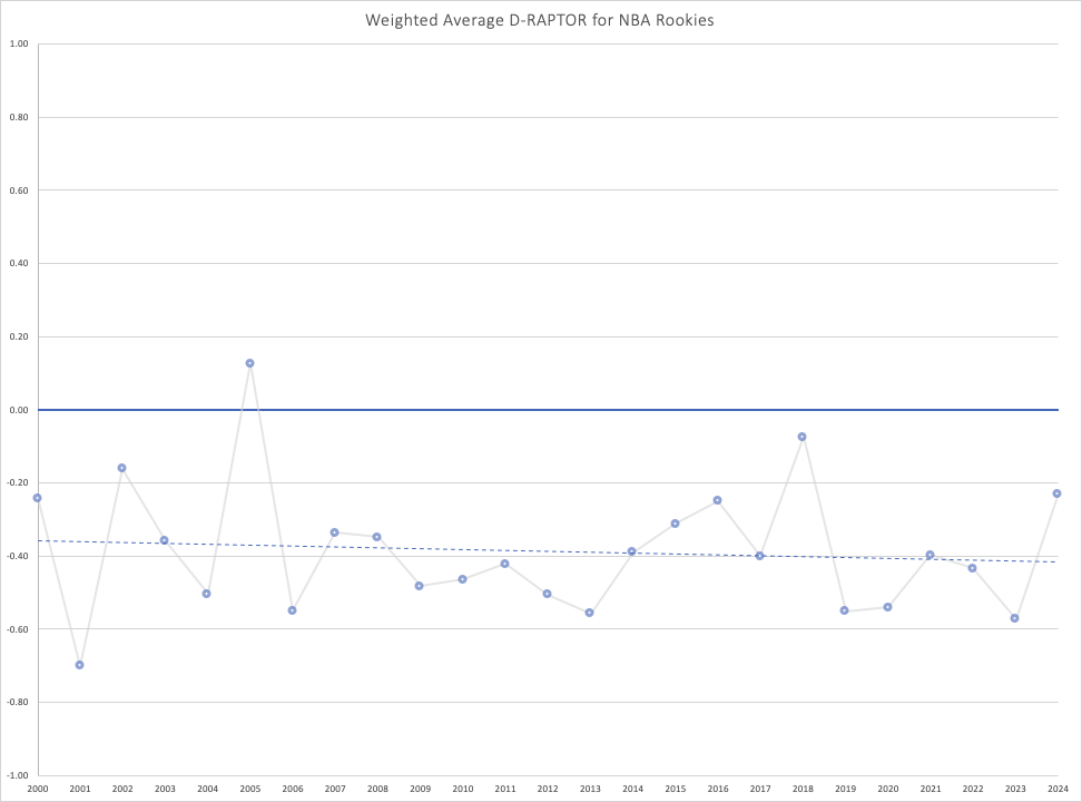 The slope evens out slightly if you remove the two seasons that look like significant outliers (2001 on the low end and 2005 on the high end), but it is still trending very slightly down. HOWEVER, the 2023-24 rookie class was significantly better than any of the previous five rookie classes, and was the second-best defensive class since that 2005 season, sitting behind only the 2017-18 rookies.