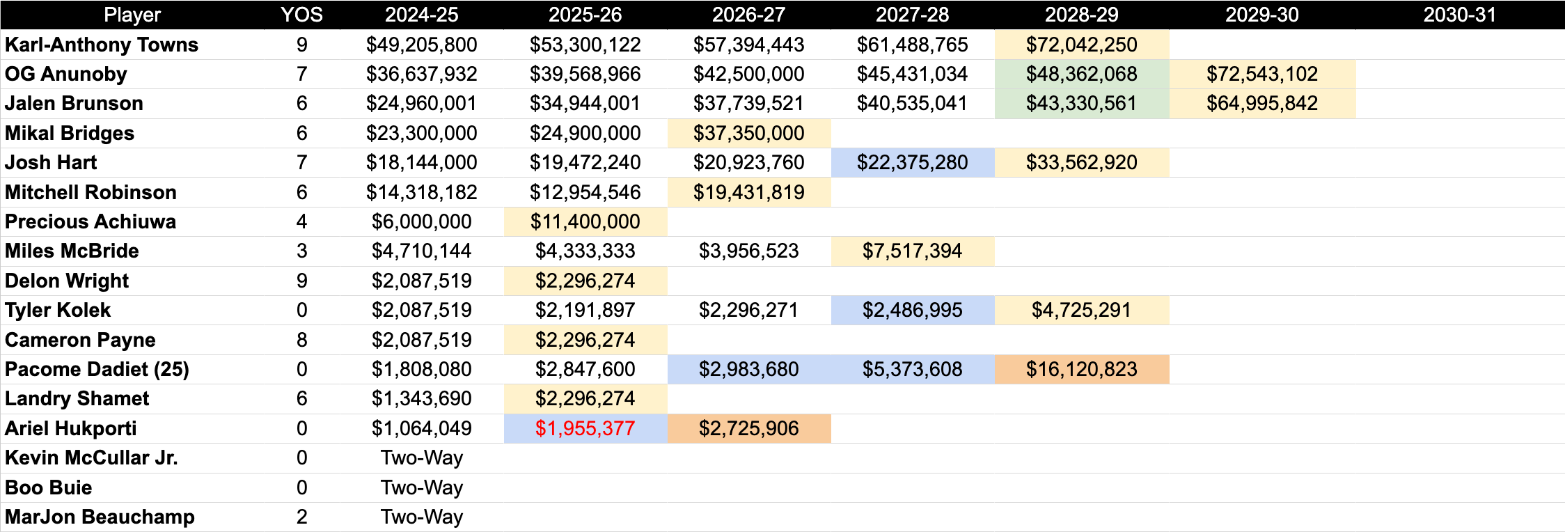 - There are a lot of decisions to be made this summer. (There will obviously be some Giannis Antetokounmpo talk, but I cannot possibly imagine a scenario where the Bucks don't get a lot more than what the Knicks can offer.) Towns and Bridges are eligible for extensions. I'd think they hold off on Towns and pay Bridges, just based on the actual dollar cost of each potential transaction. I'm already ready for the full-scale freakout at the cost of Mikal's extension. Of course, they could also decide to move on from one or both of them after just one season, if they're convinced this mix of players just doesn't work. They've been aggressive in rectifying moves that they view as mistakes, before. I think it's more difficult to do so when the moves were as costly as these were, but it's not impossible. Robinson is headed into the final year of his deal. He was obviously essential to the playoff run, and given his $13 million salary, you're probably not going to find equivalent value for him on the trade market, but it's also hard to justify giving him another contract given how infrequently he's actually on the court. If they move on from Robinson, and if Precious Achiuwa isn't back (which I can't imagine he will be), is Ariel Hukporti ready to be the backup center? (I'm skeptical.) If Thibs isn't going to be willing to play McBride with the starters, do you try to turn him into a piece that will be a better fit? You'd almost certainly have to combine him with Robinson or someone else to do so, considering his low salary. Do either Delon Wright or Landry Shamet want to come back on minimum deals again? I can't imagine Cameron Payne will be back after the way the playoffs went. Is Tyler Kolek ready to be the backup point guard if Payne and Wright are gone? Is Pacome Dadiet going to give the Knicks anything or is 2024 essentially going to turn into another draft that the Knicks punted because taking a guy mostly because he would be willing to accept 80% of the rookie scale contract, rather than because he could be a contributor? More than anything else, they really need someone else who can create off the dribble for someone other than himself. I'm not sure that guy is on the roster, and I'm not sure how they go about getting him.