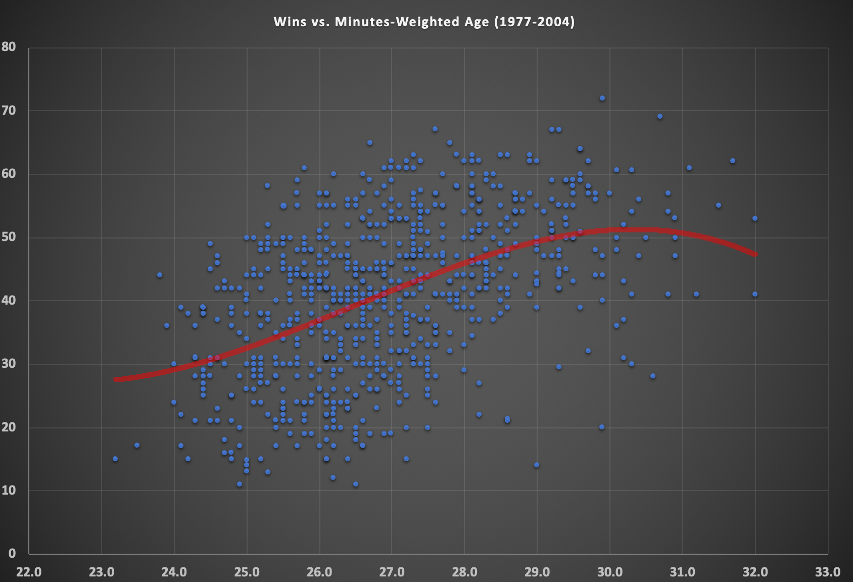 But some of this is also because the teams are, as I said earlier, much younger. There hasn't been a single team to exceed a minutes-weighted age of 30.6 during the last decade. There hasn't been a team to hit 31 years old since 2012 and nobody has gone over 32 since 2001. It's hard for the wins to drop off as teams get deeper in their 30s if no teams actually get deeper into their 30s. Still, you can see the tail begin to curve near the top of the chart, especially when looking at the 30-team era, which has a larger sample size.
