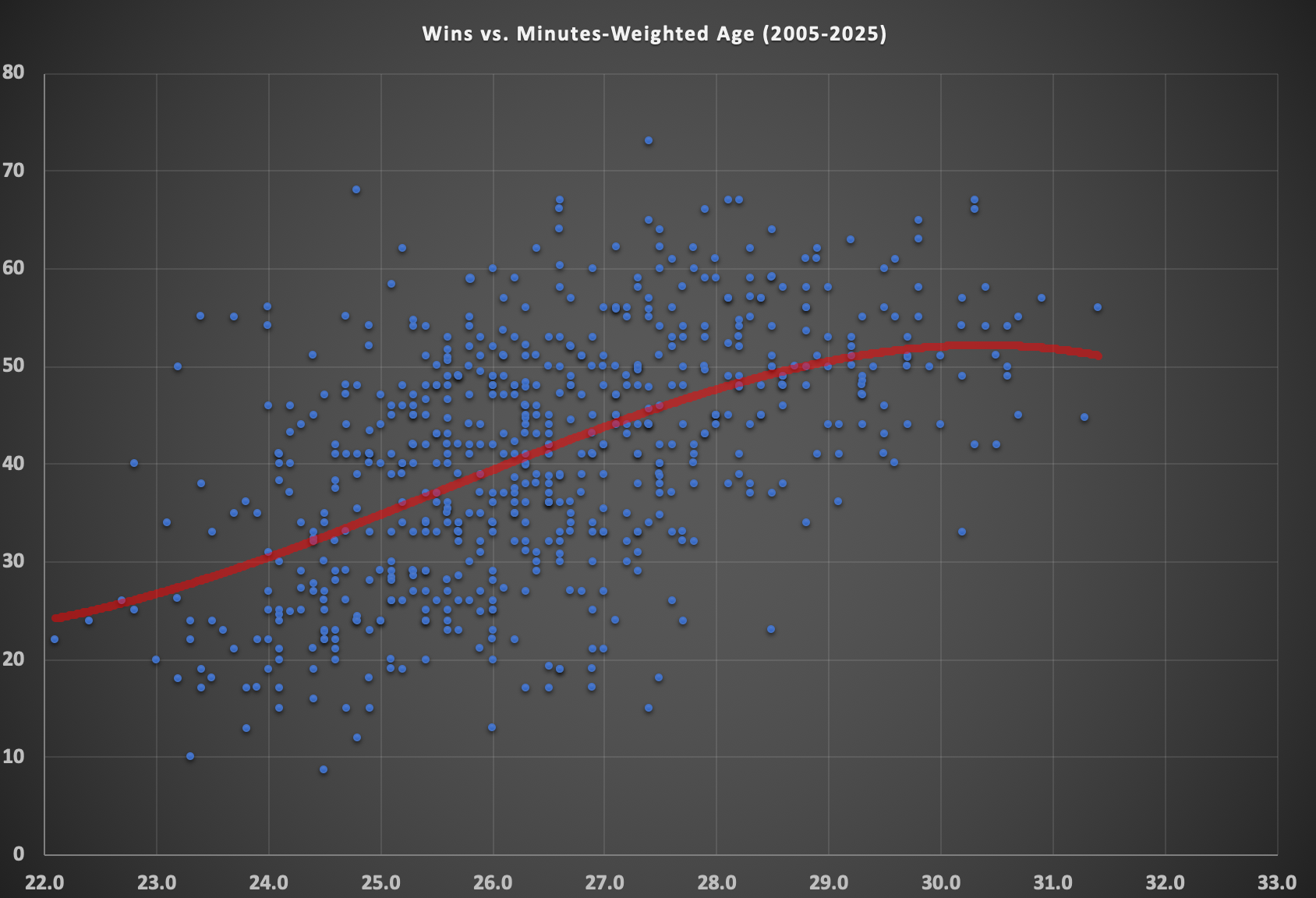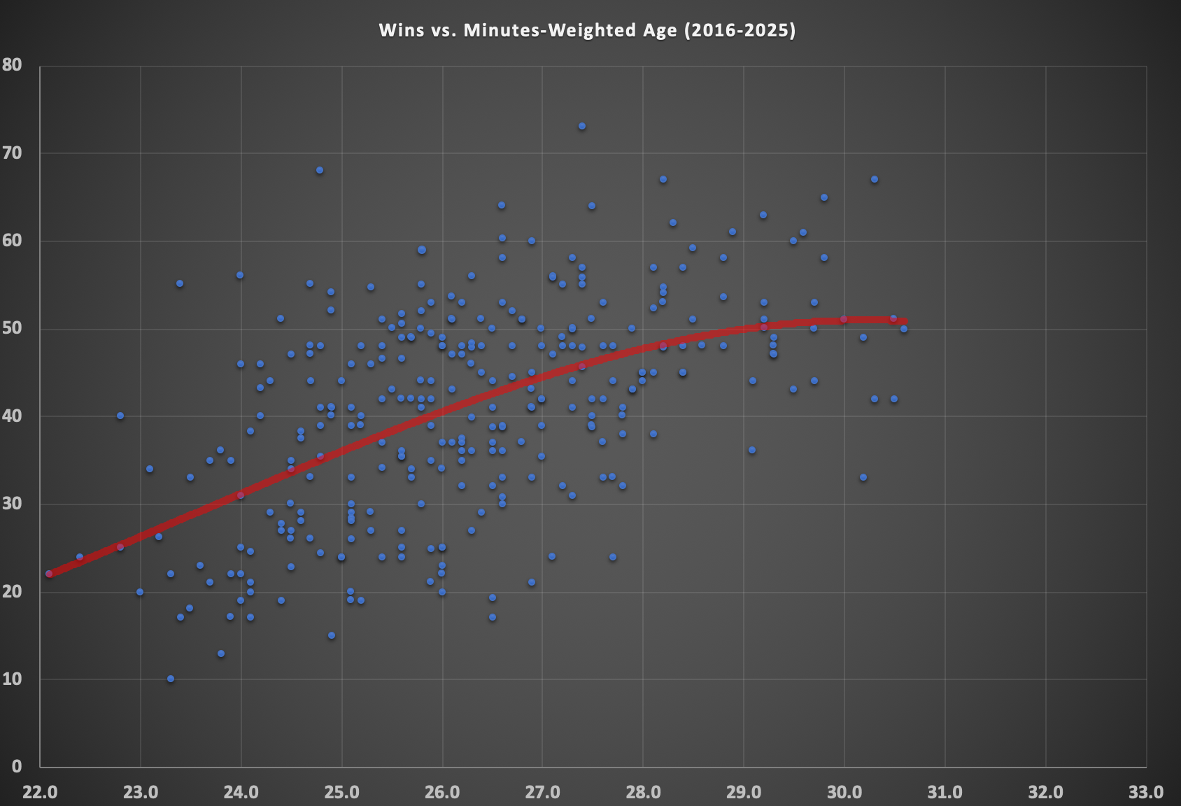 Players also tend to hit their athletic and skill peaks in their mid-to-late 20s, so it makes sense that teams in that age range tend to have the most success. And for most of history, players started tailing off in their early 30s and dropped rather precipitously from there as their bodies began to wear down. (This still happens to most players. We just have some, like LeBron James, Kevin Durant, Stephen Curry, Chris Paul, Harden, and more, who have maintained an elite level of play deeper into their 30s almost any other players in history.) So again, it makes sense that as team age pushed above 30.5 years or so, they have tended to see their record slide a bit.
