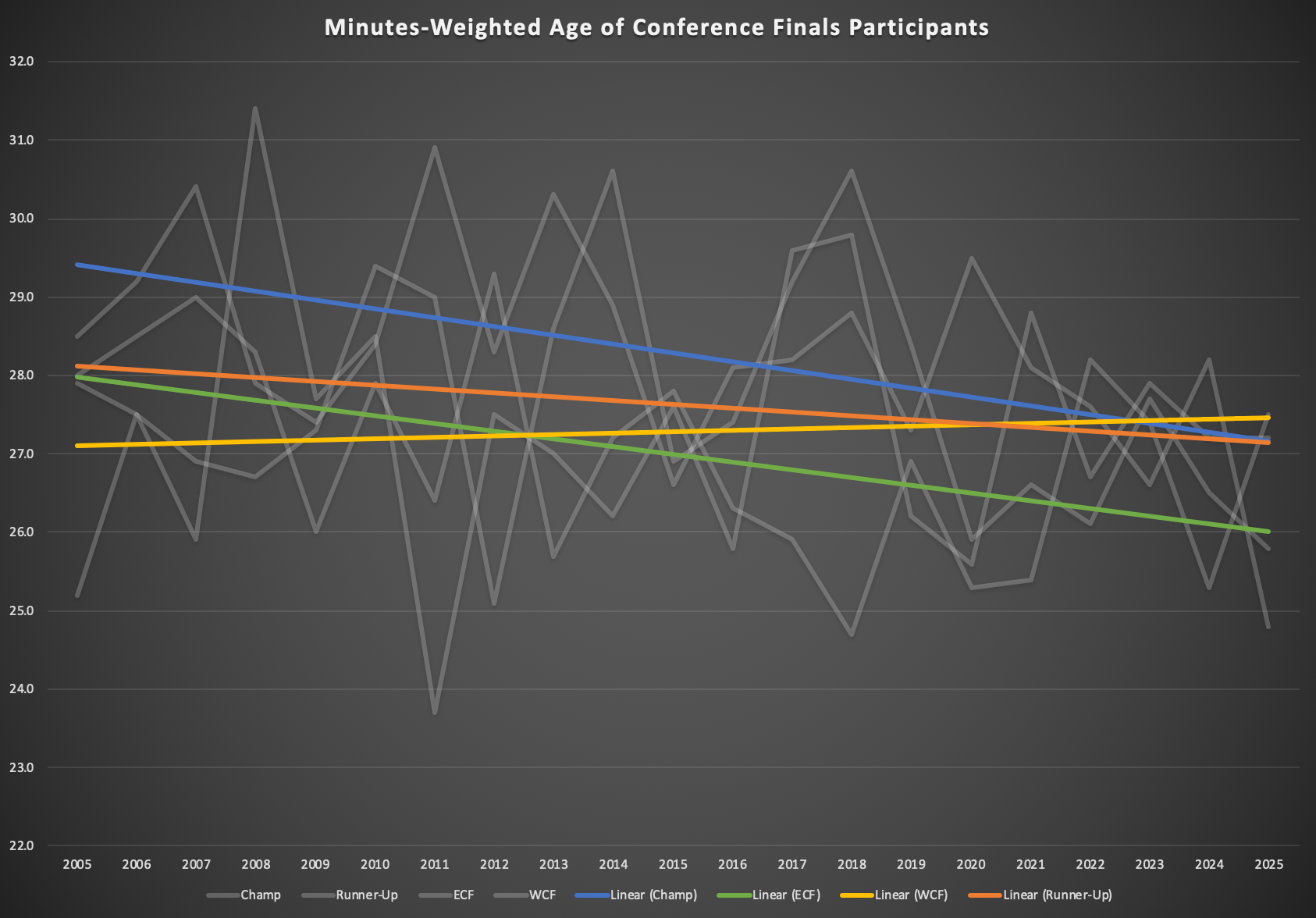 In the last decade, 10 of the 40 conference-finalists have been had a minutes-weighted age of 26 or younger and just one (those 2018 Cavs) has had a minutes-weighted age over 30. In the last five years, only four teams with a minutes-weighted age over 28 have made it as far as the conference finals. Most conference-finalists and title winners still fall in the general prime age range of 26-29 years old, but things are definitely skewing a lot younger than they used to. And when you're talking about a team with title aspirations, it feels like that matters.