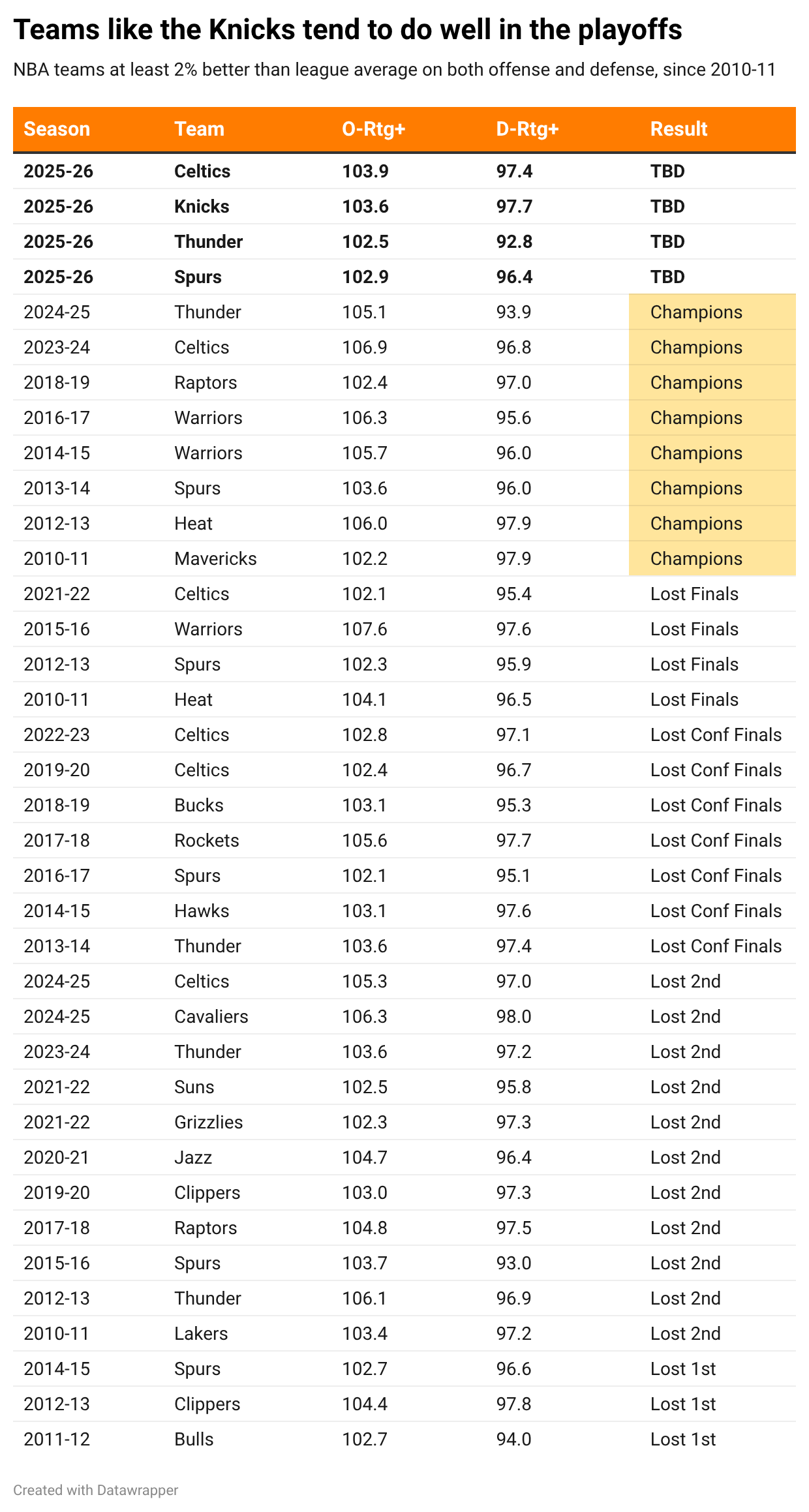 The FiveThirtyEight roster ratings don't exist anymore, but Neil Paine has replicated them with his LAKER ratings, which actually have the Knicks as a stronger regular-season team than they will be in the postseason. The same is true of ESPN's BPI. So there's a belief in at least part of the statistical community that the Knicks might not have that extra playoff gear in them.