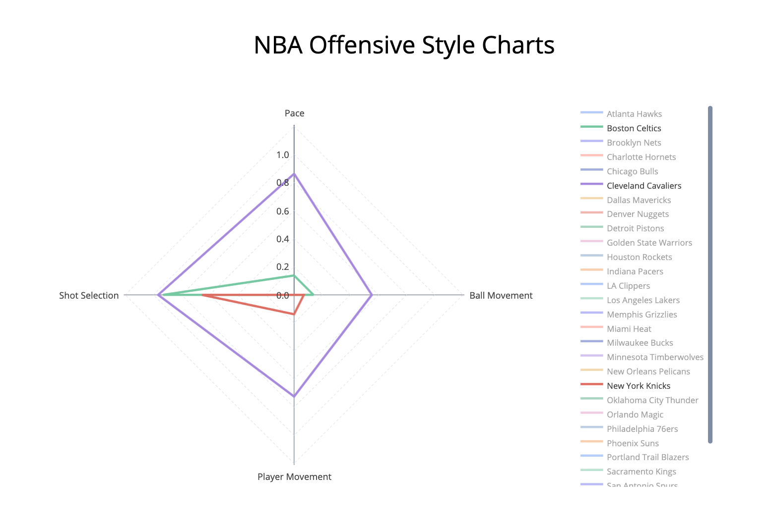 Check out the league’s three best offenses, for example. Cleveland is going about things in a way that is not remotely similar to either New York or Boston, which play somewhat similarly but also diverge in how quickly they seek shots and how much their players move around on each possession.