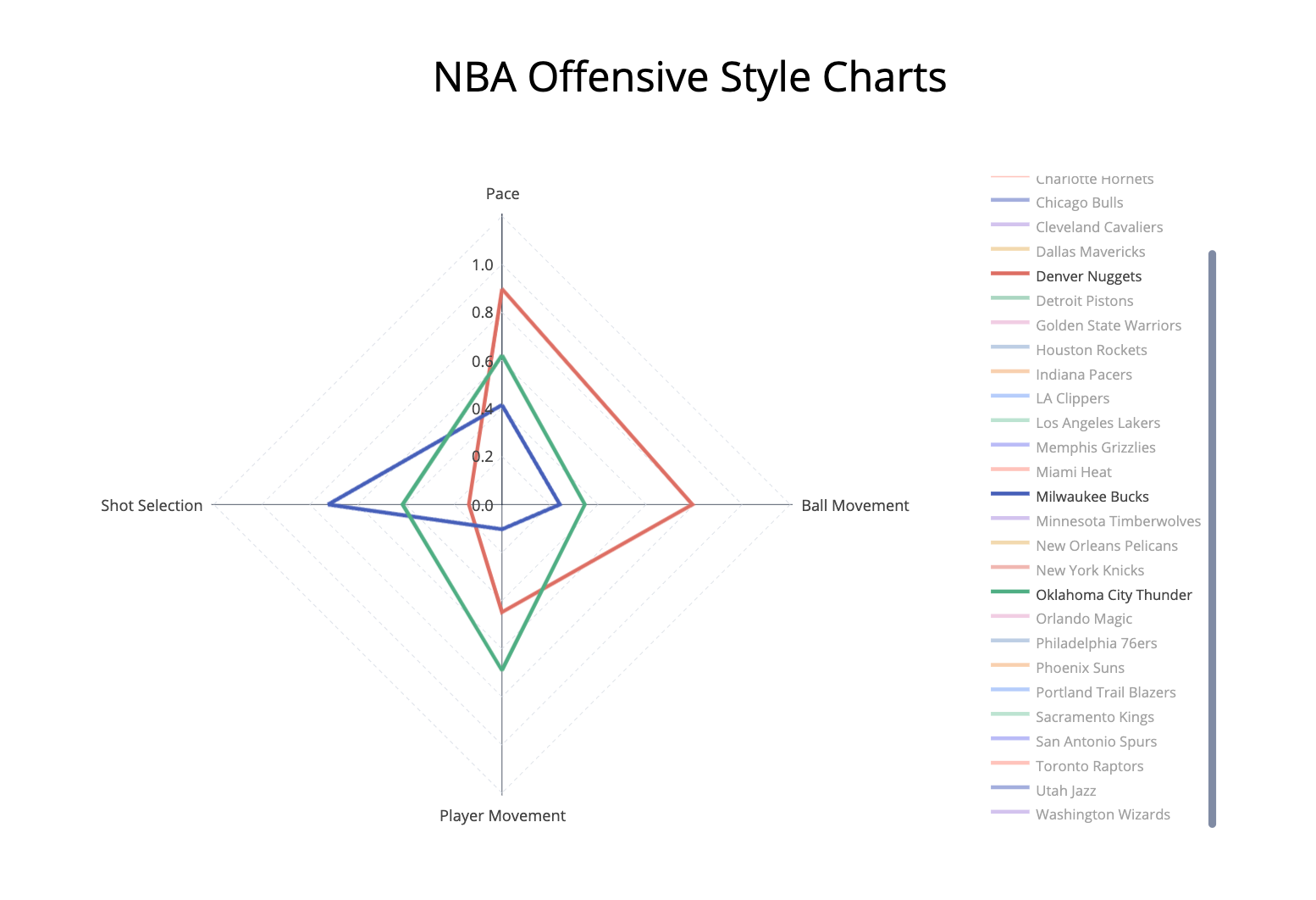 How about some of the best individual offensive players in the league? Denver plays much differently than Milwaukee, which in turn plays much differently than Oklahoma City. And that makes intuitive sense, because Nikola Jokic, Giannis Antetokounmpo, and Shai Gilgeous-Alexander are not remotely similar players. Their teams play the style of basketball that best fits their skill sets, and they all still find their way to score at a top-10 rate.