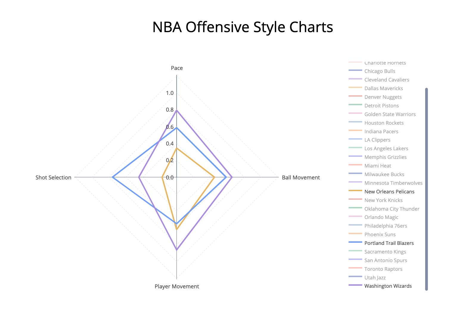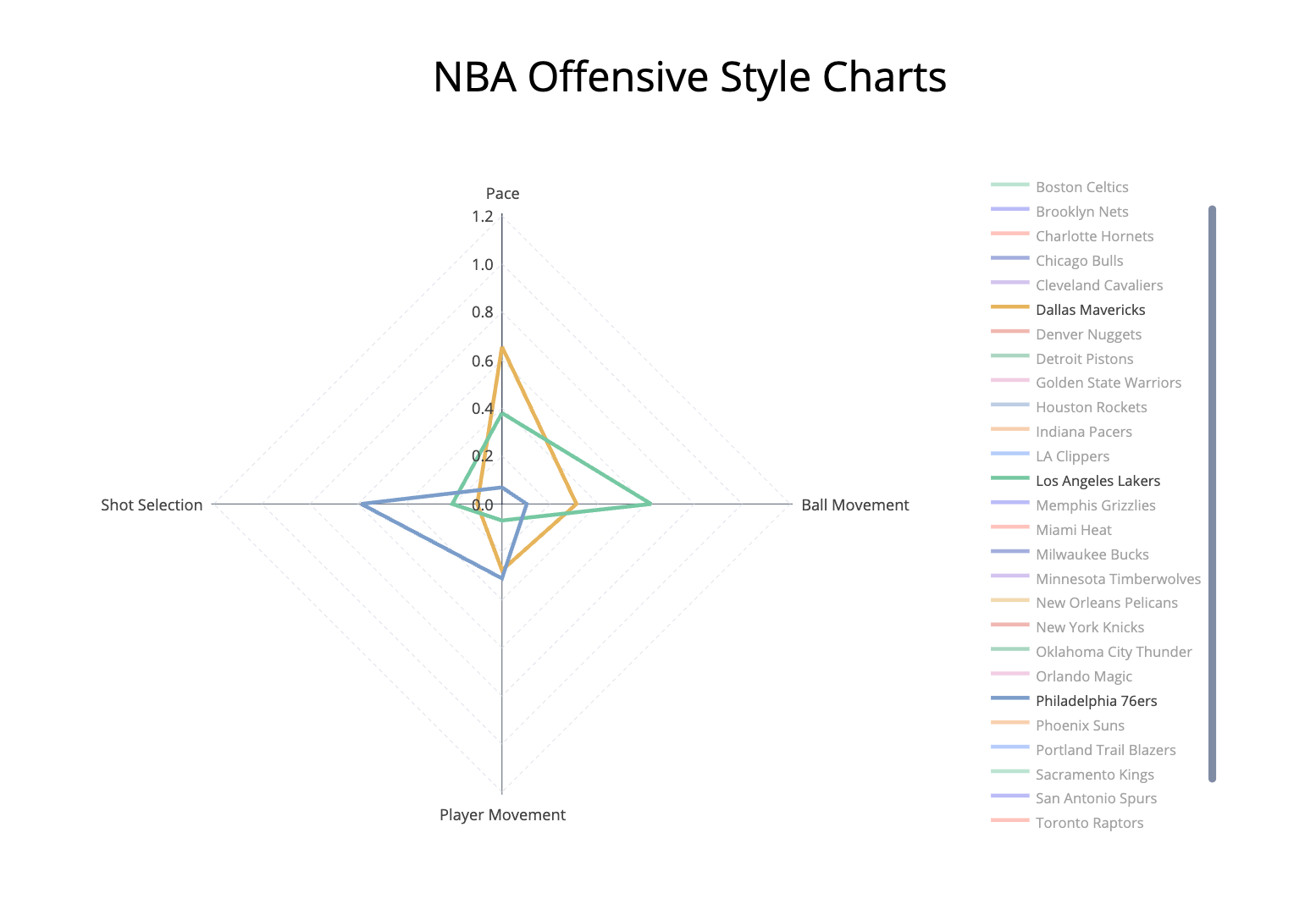 Of course, that’s just play types. They tell us what actions teams are running, but not necessarily how they go about their business offensively. To measure that, I borrowed a concept from friend of the blog Ian Levy, who back in the day created offensive style charts using the public player tracking data. I did the same analysis as Ian, using the following data points for each NBA team: