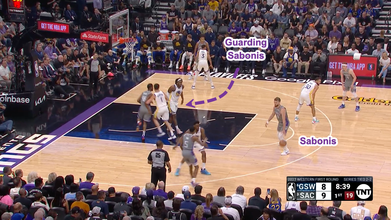 That’s Domantas Sabonis with the ball just about the elbow, and the guy guarding Sabonis (in this case and most cases so far, Kevon Looney) hanging alllllll the way back in the paint. Sabonis has been given an average of 8.775 feet between himself and the closest defender during this series, according to Second Spectrum.