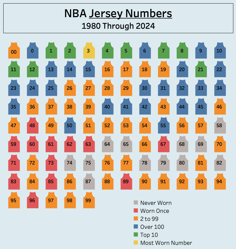 Thanks to some help from Krishna Narsu and Sravan Pannala, I was able to compile a list detailing the amount of players that wore each and every jersey number from 00 all the way to 99, in each season from 1979-80 through 2023-24, as well as the number of individual players to wear that number during that span of time. (For example, Michael Jordan is one of 192 players to wear No. 23, and he accounts for 14 of the 506 seasons for which it has been worn during this period.)