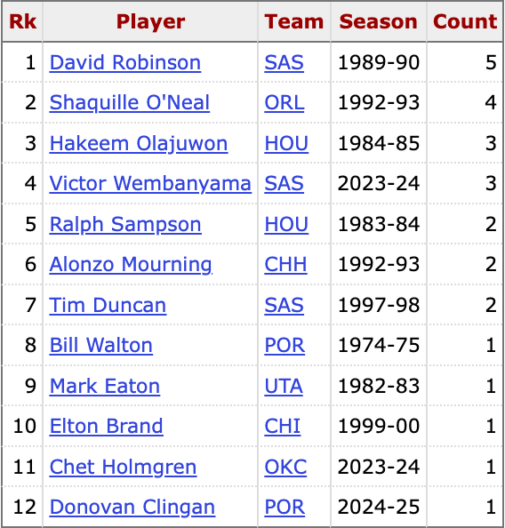 This was just the 11th start of Clingan's career, and only the second time he played at least 30 minutes in a game. In the first of those two games, he had 17 points, 12 rebounds, and 8 blocks against the Timberwolves back in November. Again, the only other players with 15-plus points, 10-plus rebounds, and 8-plus blocks in a game during their rookie year are a who's who of stars and future stars.