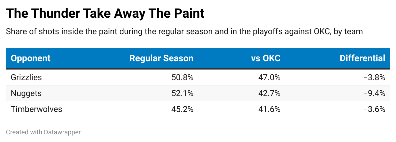 One thing we know about the Thunder's defense, above almost anything else, is that they totally choke off access to the paint. Consider what's happened to each of OKC's opponents so far in these playoffs.