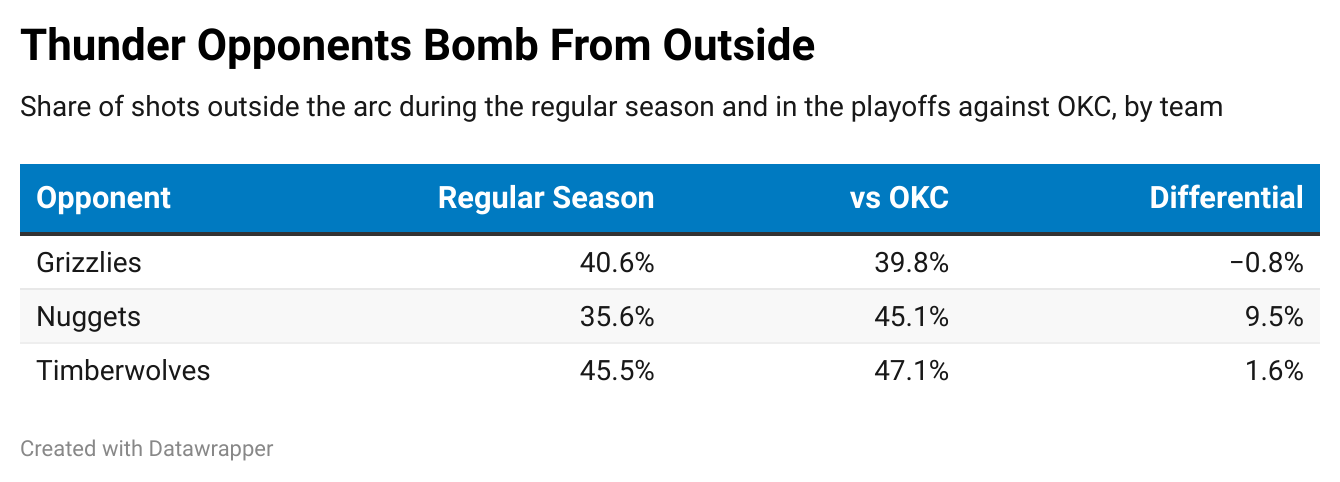 They tend to turn their opponents into three-point shooters and their games into a three-point contest. They especially did this to the Nuggets, who finished the regular season dead last in three-point rate but found themselves hoisting away from beyond the arc at a rate they don't typically want to reach.