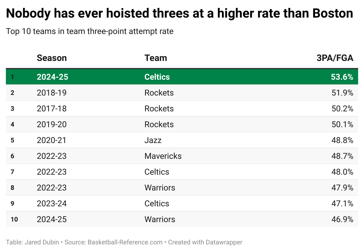 They've taken threes on at least 47.1% of their shots in each season of the Joe Mazzulla era, putting them in company with only the Mike D'Antoni Rockets in terms of teams that have done that three times in a row. (Or three times at all.)