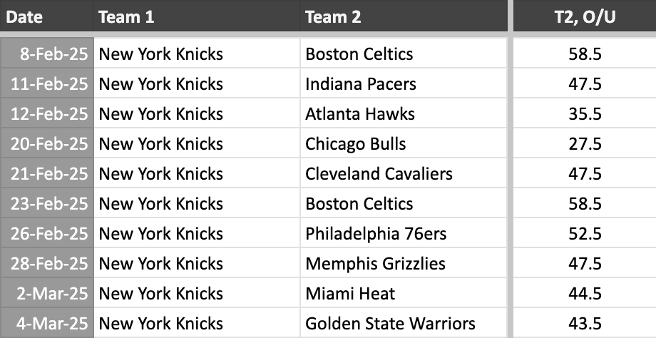 Starting just before the All-Star break and continuing after it, the Knicks get to face the Hawks and Bulls in the midst of a span where they play just two teams with an over-under above 50 wins: the Celtics and 76ers, with two days of rest in between.