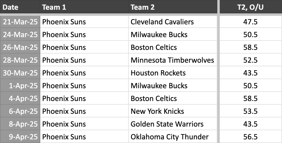 Just before the end of the season, the Suns have an absolute murderer’s row of a 10-game schedule wherein the play against the Cavs, Bucks, Celtics, Wolves, Rockets, Bucks, Celtics, Knicks, Warriors, and Thunder all in a row. That group has an average over-under of 51.5 wins, making it the single-toughest 10-game stretch any team faces all season by an incredible 1.6 wins — the same as the distance between the second-toughest stretch and the 10th-toughest.