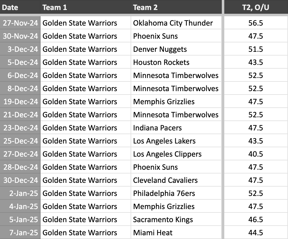 Meanwhile, the Warriors face a 17-game stretch spanning from the end of November through early January where they play exactly ONE team with an over/under below .500 — and that team is the Clippers, whose over/under is set at 40.5 wins. That’s more than 20% of their schedule!