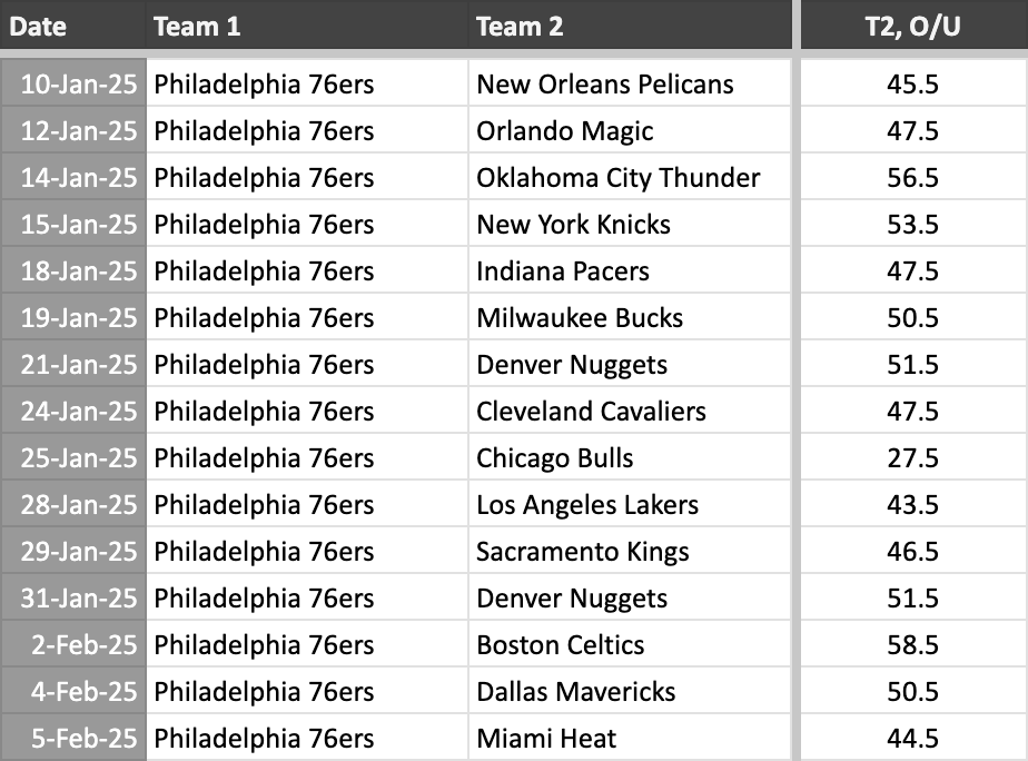 The Sixers have a roughly similar 15-game stretch from mid-January through early February; but it includes a game against the Bulls, whose over-under is just 27.5 wins. Beyond that one game, though, it is really tough for the Sixers for a while, right before the All-Star break.