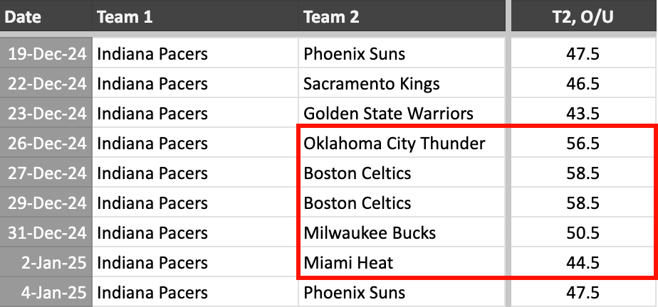 Indiana’s five-game gauntlet where the Pacers play against teams with an average over-under of 53.7 (!!!) wins comes in the midst of a nine-game stretch where they square off exclusively against teams that are projected by Vegas to finish above .500. Playing three consecutive games against the Thunder and Celtics will do that to ya.